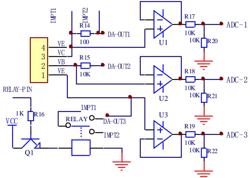 其中,DA_OUT1、DA_OUT2、DA_OUT3 是由 3 片 $\mathrm { D } / \mathrm { A }$ 转换器输出,再经过前级运算放大器比例放大和后级甲乙类互补对称功放放大后输出的模拟电压信号,分别实现对晶体管基极、集电极和发射极的电压或电流信号进行控制,并由基极和集电极提供的变化的电压或电流信号建立测试条件。基极限流电阻取值要求在KΩ 级,保证基极电流在 uA数量级,防止晶体管输出特性曲线出现失真。三个电极获得的电压信号经过由 LM358 运放构成的电压跟随器,送到单片机内置的 3 路 A/D 转换器中进行模/数转换。