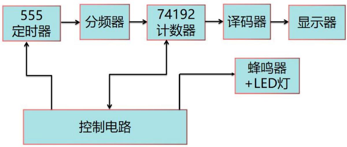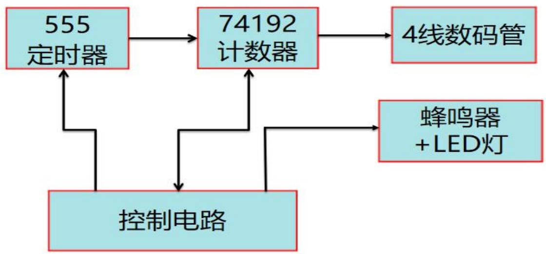 本实验项目实现的原理为555定时器、计数器、译码器的综合应用。采用模块化的设计思想, 具体涉及到555定时器的应用、 计数器的级联、 译码器显示的原理 数码管的应用、 基本门电路的应用、 报警电路的实现、 控制方式的实现。 设计此倒计时器时 采月 模块化的设计思想, 使设计起来更加简单、 方便、 快捷, 方案框图如下图1所示。
