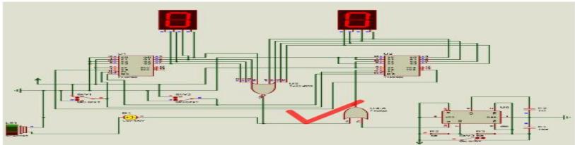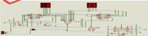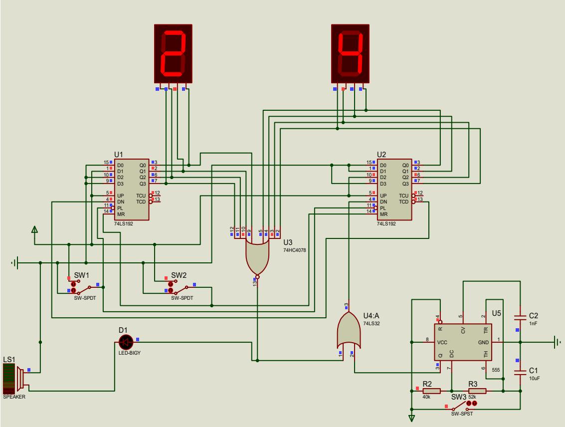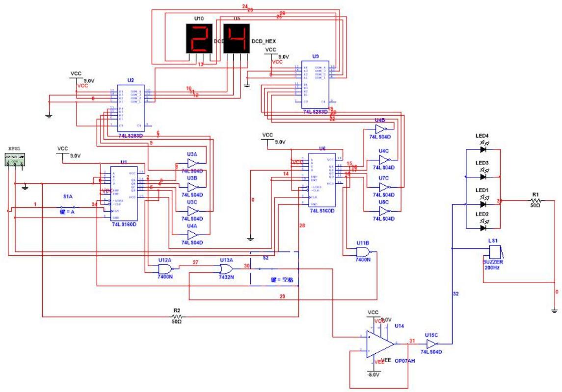 根据原理图,秒脉冲发生器选用由555定时器构成的多谐振荡器来实现,24秒计时器可以选用2位十进制的74LS192实现, 显示电路采用带内部译码驱动的4线数码管,报警电路采用8输入与非门电路74HC4078配合LED灯和蜂鸣器来实现, 有 三个控制开关实现复位、 启动、 暂停/继续功能, 图2(a)为计数器的初始状态显示24, 图2(b)为计时器计时状态 2(c) 为计时器计时完成报警状态。