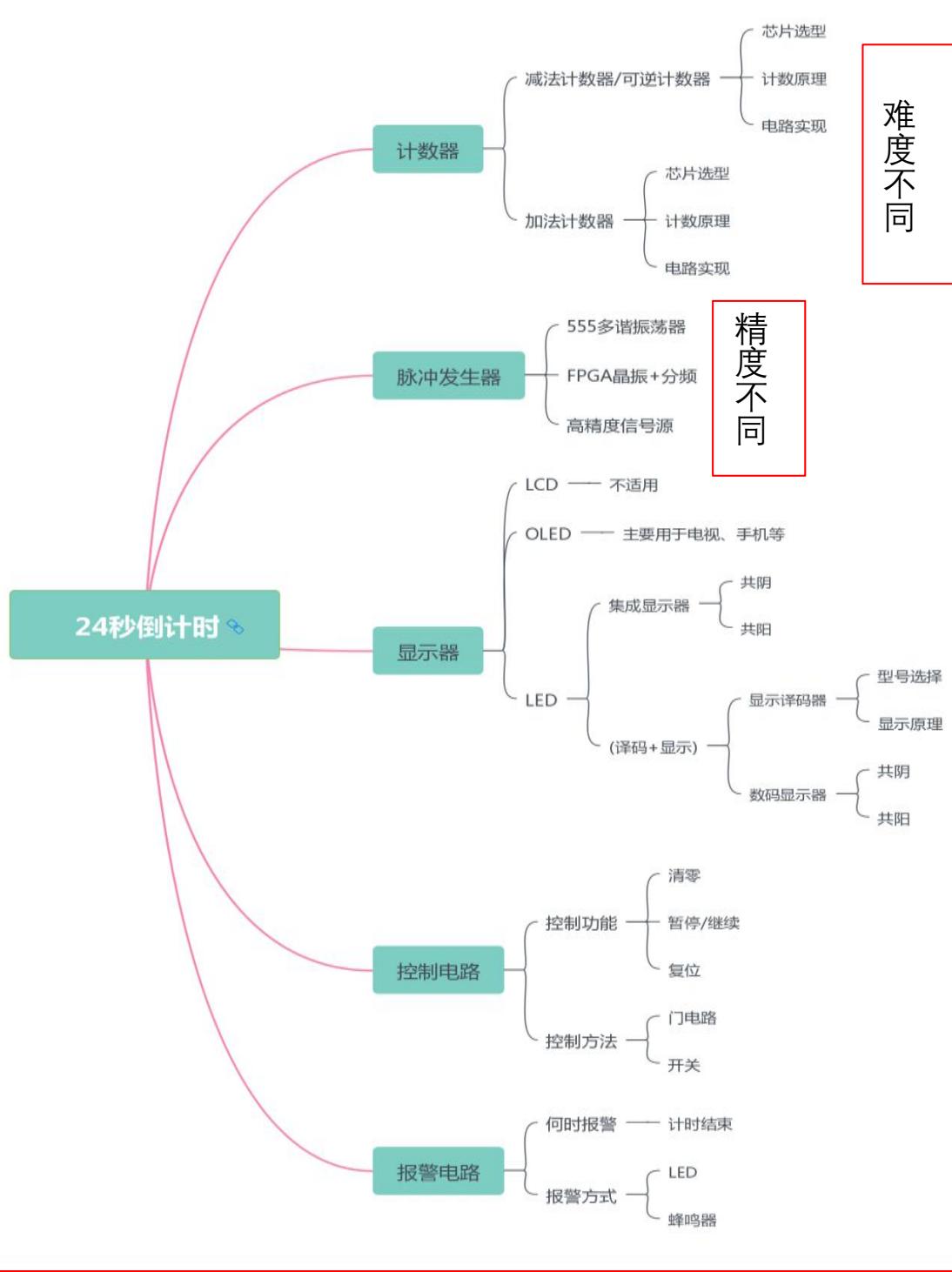 4)实验中思考,考虑不同方案的,采用不同类型的计数器,或者不同计数原理之类的?各种方案有什么区别?如果修改倒计时的时间该如何设计?如果修改时钟频率该怎么做?各种方案的计时精度有什么不同等问题;