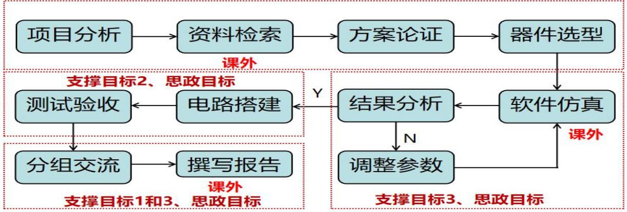 如图1所示,整个实验过程贯穿项目分析、资料检索、方案论证、器件选型、仿真、结果分析、沟通反馈、电路搭建、测试验收、分组交流、撰写报告等完整的工程项目开发流程,其中一些环节的内容和要求如下: