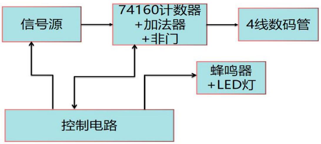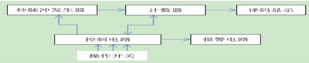 本实现项目按照模块化的设计思想,本实验项目可以分解为秒脉冲发生模块、计数器模块、显示器模块、报警模块和控制模块等五个模块组成;每个模块电路都可以由多种方案实现;对比分析每个方案的不同点及模块之间的关联。