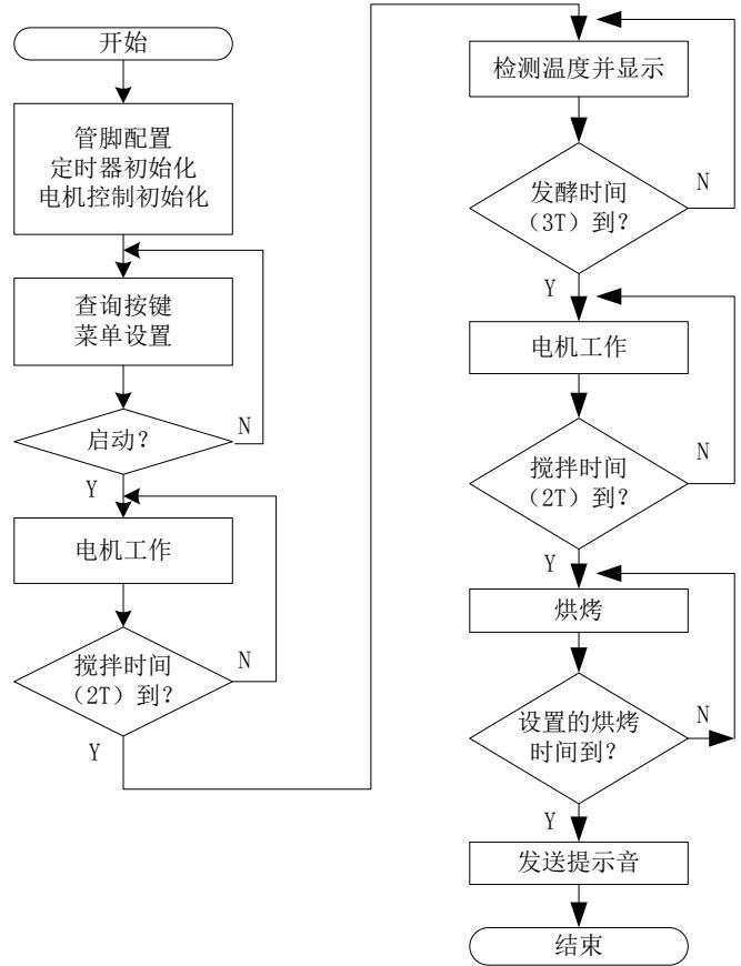 实验要求设计一个模拟面包机工作的控制系统,能够实现面包的全自动制作。面包机的控制系统主要包括PIC单片机、按键、显示模块、温度测量模块、电机及其驱动模块、蜂鸣器等。面包机控制过程如图 1 所示: