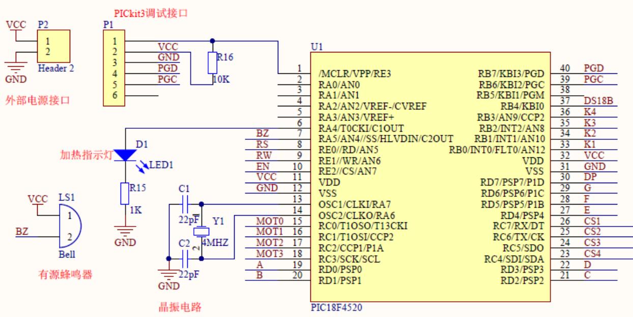 | 主要器件 | PIC18F4520单片机、按键、1*4键盘、数码管、LCD模块、DS18B20温度测量模块、电机及其驱动板、有源蜂鸣器、晶振等 | |||||