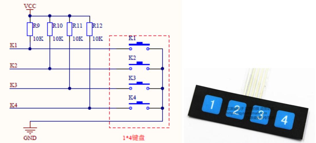 图 4 4 按键 $/ 1 ^ { * } 4$ 键盘原理图及 $1 ^ { * } 4$ 键盘外观图