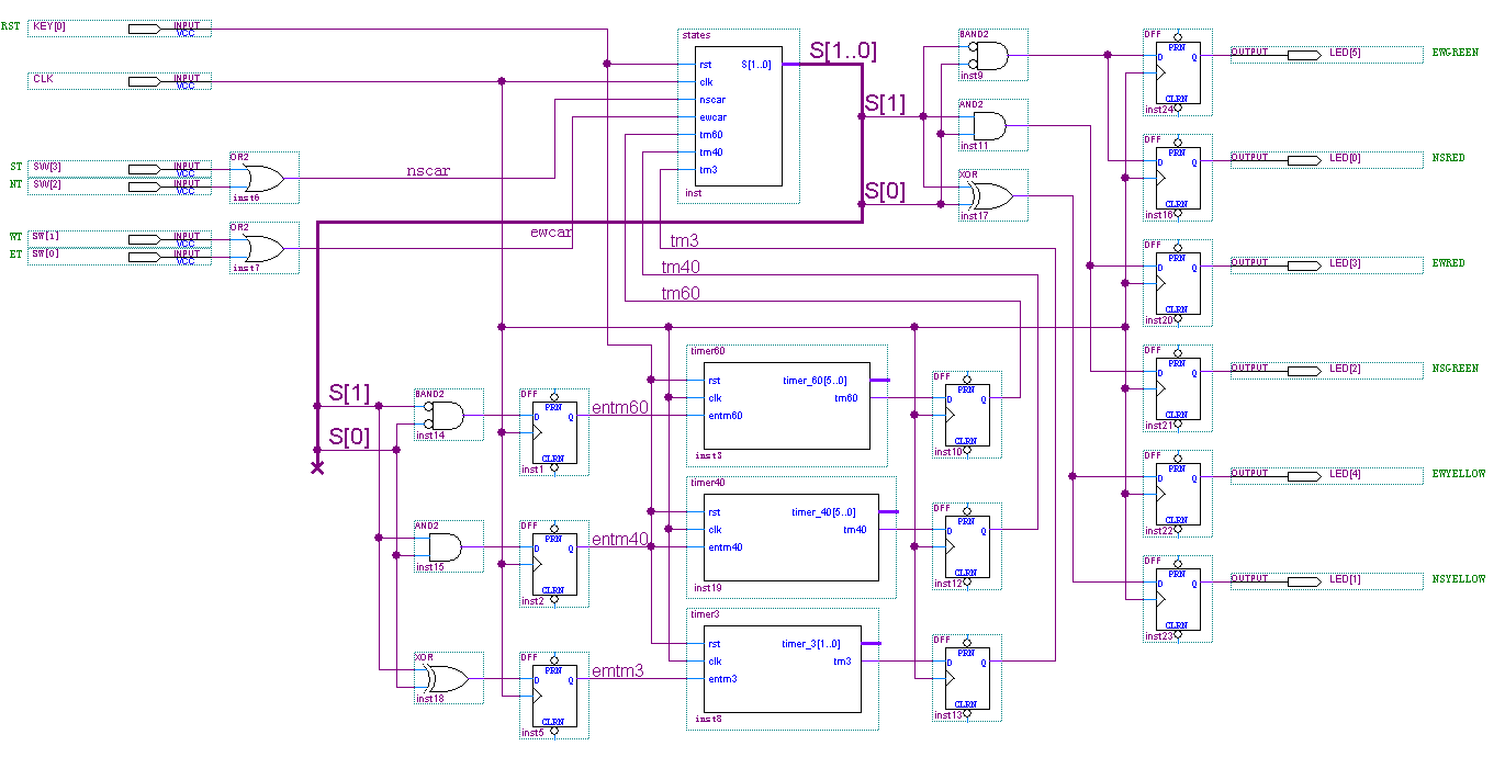 同学们经过仿真发现延迟问题,将多出的12个触发器删除,如图6-3所示,成为与课堂上相同的交通灯。