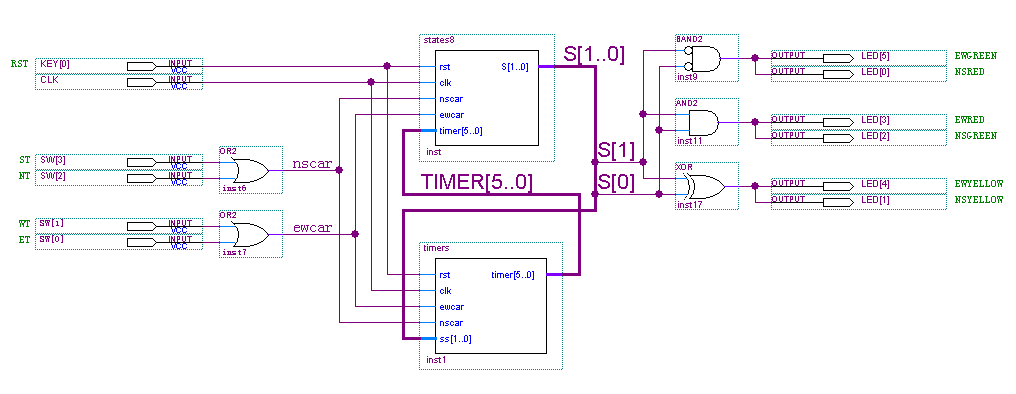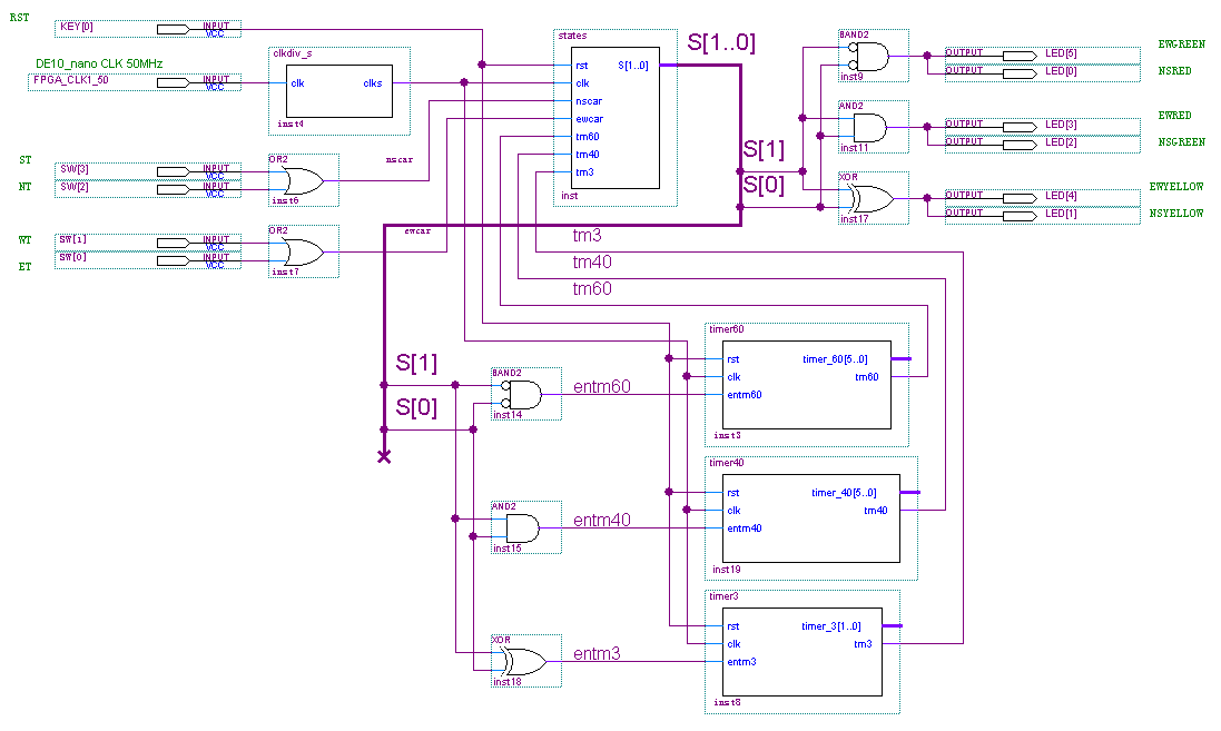 (4)展示用Quartus II 软件图形界面设计的交通灯。沿着输入到输出的顺序给学生讲解电路结构图。