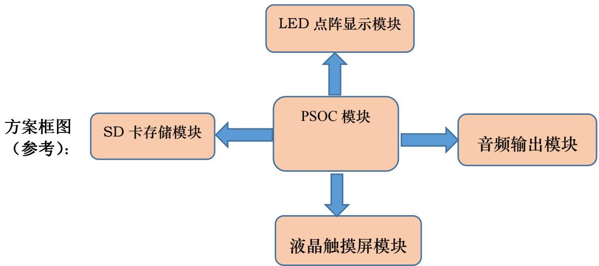 设计任务:基于 PSOC 模数混合系统实验平台,分模块设计并实现由触摸屏控制的音乐播放,并随着播放音乐LED 点阵花型变换的音乐彩灯系统。