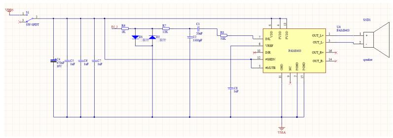 音频输出模块主要由功放芯片 pam8403,滤波电路和喇叭组成,对 PSOC输出的音频信号进行放大滤波后经由喇叭播放。