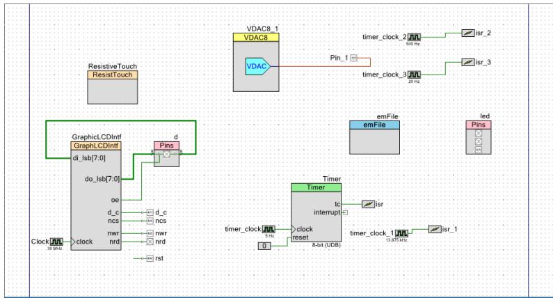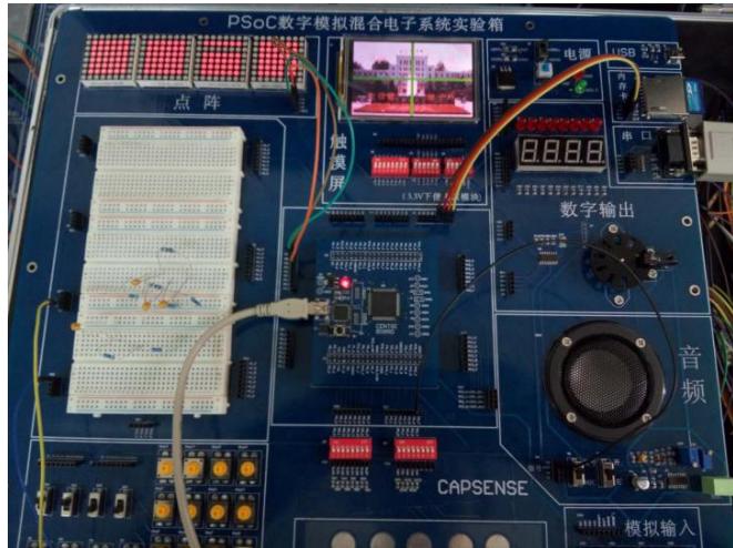 3)要求学生按照实验指导书学习 PSOC 实验平台结构及用法,重点掌握本实验涉及的 LCD 触摸屏触摸显示、DAC 转换、SD 卡采集、LED 点阵显示、功放电路各模块的内部结构和用法。