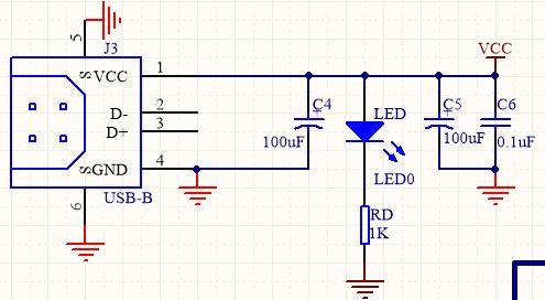 如图5所示,系统采用 USB 供电。图中两个 100µF 电容的作用是滤波,0.1µF 电容的作用是滤除高频分量,LED 是电源指示灯。