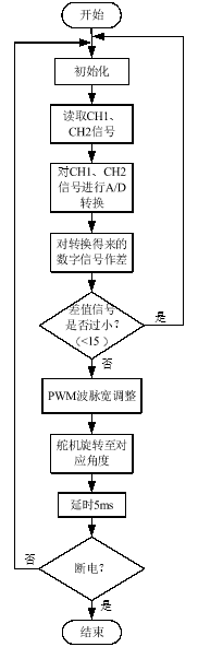 在收到光照时,直接将数据进行对应,通过ADC模块输出数字信号,将信号调整成舵机可以识别的对应脉宽的PWM波,从而控制舵机转动到对应的位置,控制程序流程如图6所示。