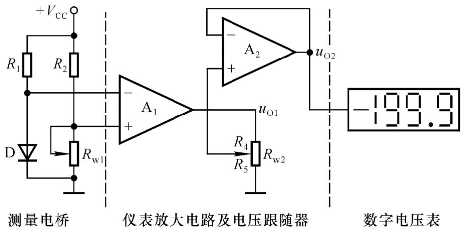 利用二极管、运算放大器等常用模拟器件,设计并制作一个温度测量电路。使用普通二极管作为测量元件,利用二极管灵敏的温度特性,要求能自动测量温度,并以适当的方式显示出来。