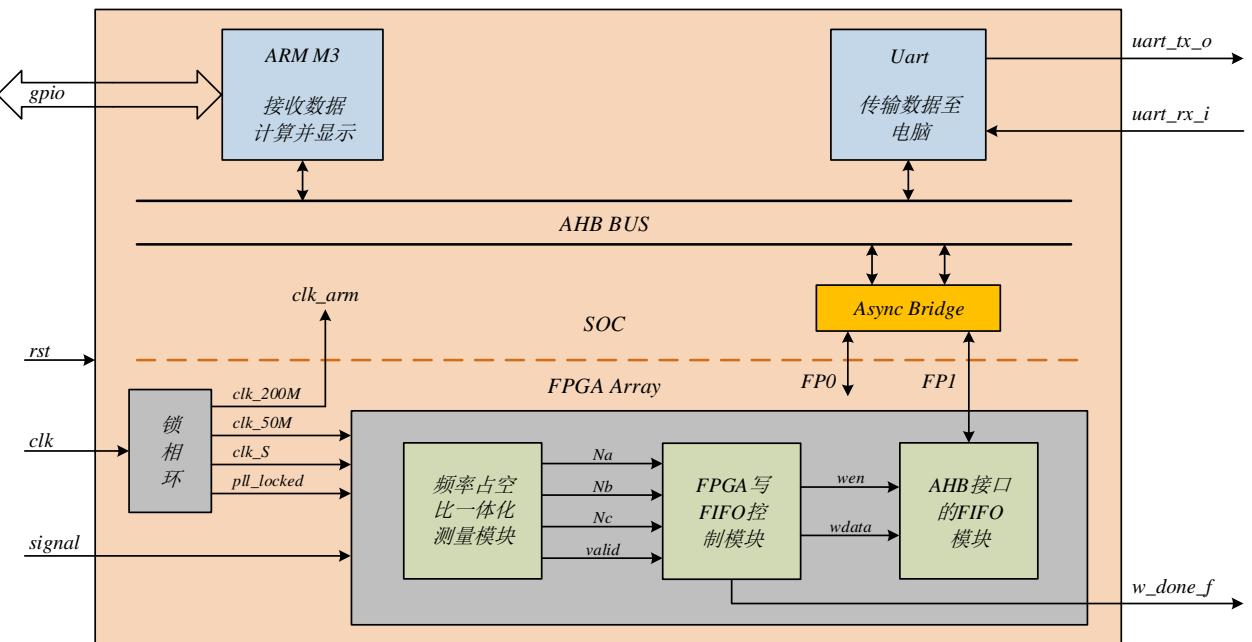 1) 利用 SOPC 技术,以内嵌 ARM Cortex-M3 内核的 FPGA 芯片为控制核心,利用 Verilog 硬件描述语言对 FPGA模块进行设计,利用C语言对 Cortex-M3内核部分的程序进行设计,并借助 AHB 接口的 FIFO 实现 FPGA 与 Cortex-M3 内核之间的数据通信,完成等精度频率计的设计,可以实现频率测量和占空比测量功能;
