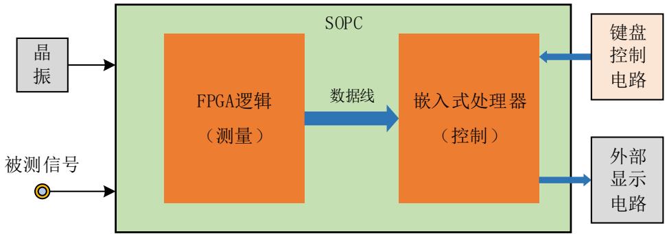本实验的系统结构如图 1所示,外部晶振产生标准时钟信号作为整个系统的基准时钟,SOPC系统中的FPGA逻辑部分用于频率和占空比的测量,并产生测量数据,然后利用一定的数据通讯方式将其传输至嵌入式处理器中。嵌入式处理器根据实际采用的方法和测得的数据来计算测量所得的频率值和占空比值,然后控制外部显示模块显示结果,而键盘控制电路可以利用键盘对系统复位、控制测量等。另外,图 1 所示的系统结构只是一个参考图,在实际设计中,可以根据系统需求适当扩充其他的外围电路。