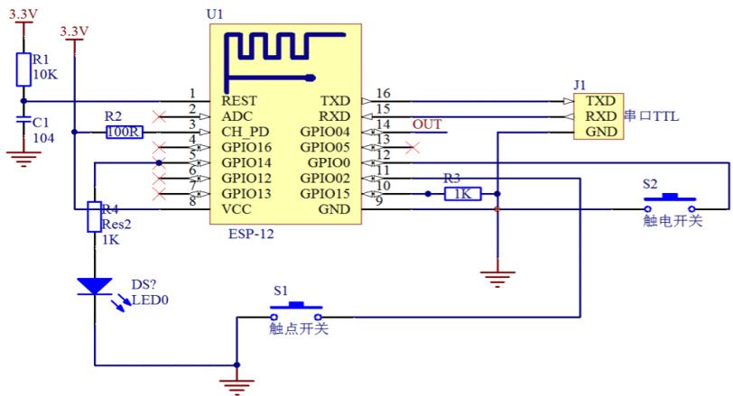 GC8266TR2.4W 无线模块虽然仅包含 UTXD、URXD、GPIO0、GPIO2、RST及 CH_PD 六个外部接口引脚。但 ESP8266EX 芯片内的 GPIO 口多达 17 个,它能通过对寄存器配置实现不同的功能。另外,该芯片还具有丰富的外设接口资源,不仅能通过外接闪存寄存器进行独立使用,还可通过外部 SPI 接口、SDIO 接口或 UART 接口与微控制器相连,一起作为 WIFI 适配器来使用。本系统 WIFI 模块中的 ESP8266EX 芯片与串口连接的电路原理图如图 3.7 所示。当 MCU 与 WIFI模块需要进行通信时,CH_PD 引脚须外接高电平,且复位引脚 RST 也要外接高电平。通信端口引脚与 MCU 相连时需采用交叉相连的方式,即将主控模块中微控制器端的 TXD 引脚与 WIFI 模块的接收端 RXD 引脚相连,微控制器的 RXD引脚与 WIFI 模块的发送端 TXD 引脚相连。当通信引脚连接完成后,微控制器可通过 UART 串口向 WIFI 模块发送配置参数 AT 指令完成对 WIFI 模块基本参数的配置。待参数配置完成后,MCU 方可通过 WIFI 模块实现与用户终端通信的功能。如图4所示。