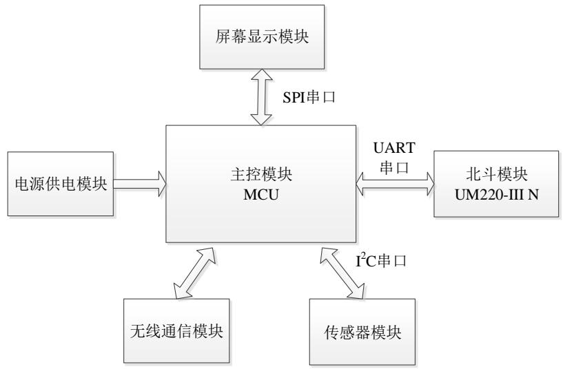 1)模块——系统的设计思想。根据已有条件,搭建一个基于北斗的便携式软硬件结合的定时定位系统,主要功能是接收北斗模块、传感器模块的信息并将所测量的数据在MCU 进行处理,最终在屏幕上显示出便于读取的定时定位数据信息。
