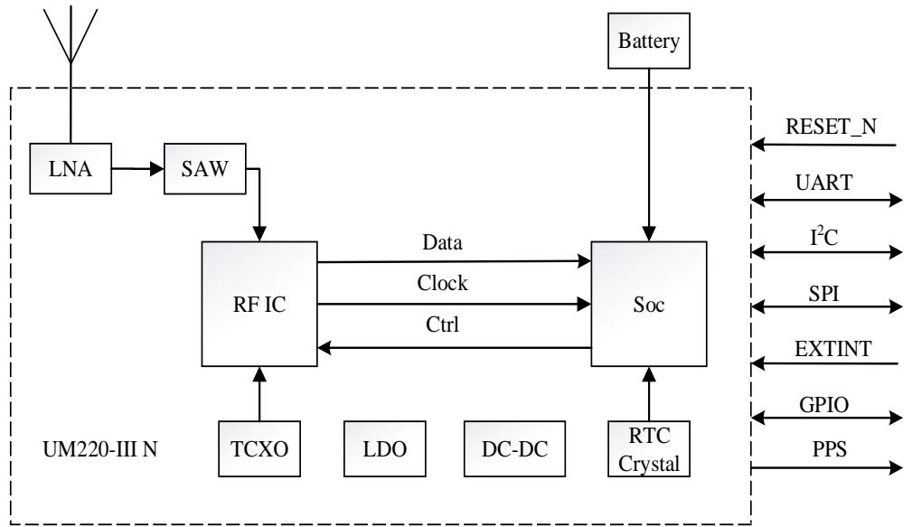 在本实验所设计的北斗定时定位系统中,北斗/GPS 模块部分选用的是和芯星通公司的 UM220-III N 模块。该模块是包含北斗和 GPS 双模系统高性能的GNSS 模块,它可同时采集到北斗二号的 B1 与GPS 系统 L1的两个频段点的卫星信号,能实现在北斗/GPS 单模定位或双模定位间灵活切换的定位方式错误!未找到引用源。。由于 UM220-III N 模块具有捕获信号速度敏捷、超强的抗干扰能力、小巧便携、耗电量慢等优点,能够满足北斗系统大多数应用场景的需求。在图3 中,展示了 UM220-III N的内部结构框图。