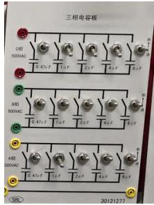 如图 3 所示,强电实验背板上装有一组三相电容器模块,单相电容的额定电压值 500V,电容参数分别为 $0 . 4 7 \mu \mathsf { F }$ , $\mathsf { 1 } \mu \mathsf { F }$ , $2 \mu \mathsf { F }$ , $4 \mu \mathsf { F }$ , ${ } ^ { 8 \mu \mathsf { F } }$ ,可通过参数值旁边的通断开关来控制调节。