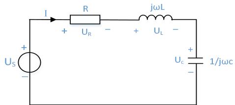 图 1 所示为一简单的 RLC 串联电路,依据电路原理,当施以正弦交流电压时,线路中的电流有效值 ${ \cal I } = \frac { U } { \vert { \cal Z } \vert } \frac { U } { \sqrt { R ^ { 2 } + \left( \omega L - \frac { 1 } { \omega c } \right) ^ { 2 } } }$ ,线路总阻抗值 $Z = \sqrt { R ^ { 2 } + \left( \omega L - \frac { 1 } { \omega C } \right) ^ { 2 } }$