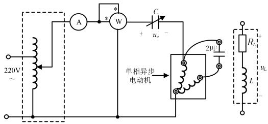 电路采用一电容分相式单相异步电机为负载,并施以正弦交流电压,同时选用一电容器组与之相串联组成 LC 振荡回路,通过改变电容 C 使其达到谐振,再用电压、电流表及功率表分别测量该电路中各有关参数,此时,由负载电压、电容电压和线路总电压闭合组成一三角形,通过几何关系即可求出电机的等效内阻和电感值,实验电路如图 2 所示。