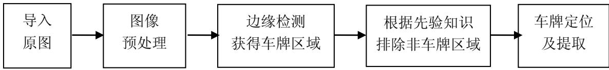 车牌定位可依照以下流程图进行。首先导入原图;之后通过灰度化、图像去噪、对比度拉伸等一系列预处理操作得到清晰的待处理图像;然后通过边缘检测提取图像边缘,由于车牌区域存在相对连续的多次灰度跳变,且两次跳变间距在一定范围之内,而非车牌区域则一般不具有这个特征,故可通过行列扫描统计跳变数获得初步的车牌区域;上述方法搜索得到的候选区域可能不止一个,因此结合一般车牌通常是蓝底白字,长宽比 3:1 的先验知识排除非车牌区域;最后定位并提取车牌。