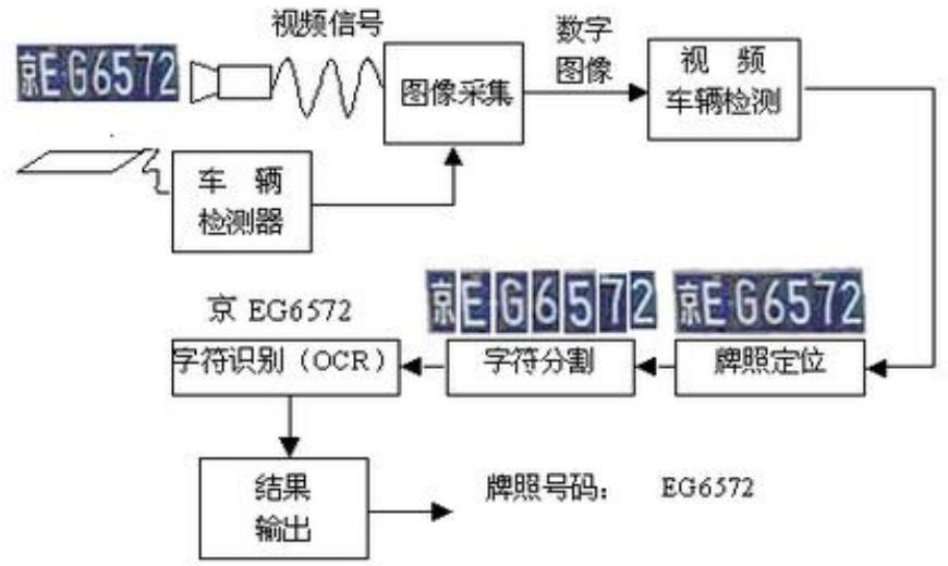 一个完整的牌照识别系统包括车辆检测、图像采集、牌照识别等几部分,如下图所示。当车辆检测部分检测到车辆到达时触发图像采集单元,采集当前的视频图像。牌照识别单元对图像进行处理,定位出牌照位置,再将牌照中的字符分割出来进行识别,然后组成牌照号码输出。