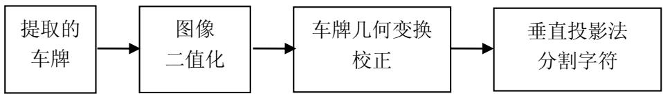 字符分割可依照以下流程图进行。首先导入定位提取后的车牌图像;之后进行图像二值化,以实现前景字符和背景色的分离,这样可以大大减小后续工作的计算复杂度;由于牌照图像很有可能出现倾斜,且任何一种倾斜都会影响牌照字符的划分,所以可通过几何变换对车牌图像进行缩放、旋转、平移等,以矫正车牌的形变及倾斜;最后通过垂直投影法把车牌区域图像分割成单个字符图像。