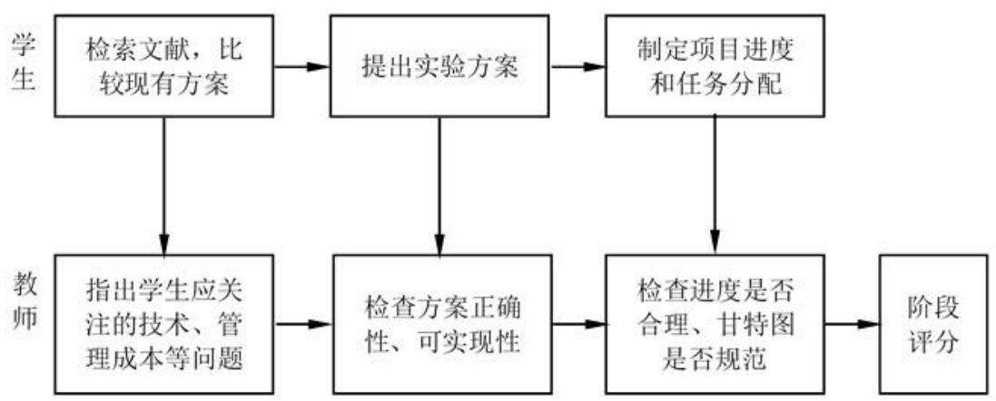 3)引导学生利用现代工程管理工具来推进项目进度。本项目团队由三个小组、每组两人总共 6 人构成,三个小组分六个星期先后进入实验室,每小组的工作都是后续小组的基础,所以一旦出现某个小组不能按时完成任务,就会影响整个项目进度,因此在项目之初就让学生们学习利用甘特图规划项目进度的方法,团队成员自行推举了负责人,要求负责人统一制定项目进度规划、分配资源和任务。