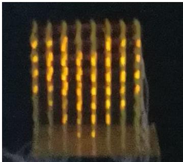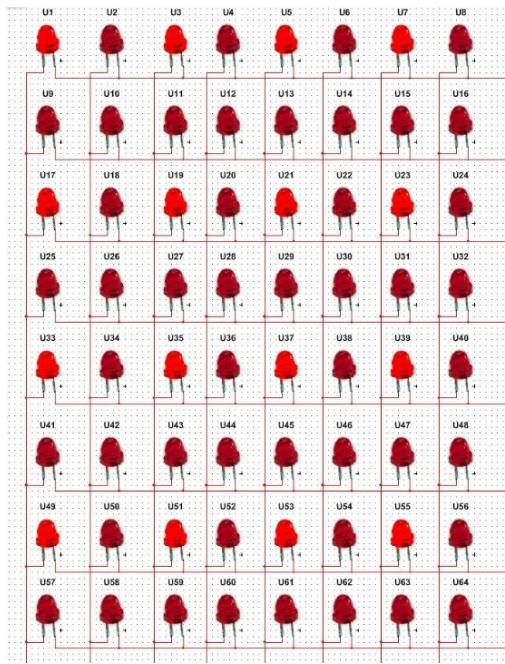 在硬件设计阶段引入了虚拟实验,在multisim软件下搭建了 $8 ^ { * } 8$ 虚拟LED点阵如图4所示。引入虚拟实验教学的目的有两个:一是打破实验室实验的时间限制,学生可以充分利用课外时间进行硬件设计与调试。学生在焊接硬件电路前可以在课外时间对此点阵进行仿真操作,由于multisim 提供了与实际器件外观高度相似的虚拟器件和 Interactive 仿真模式,学生不仅可在此虚拟实验环境中得到与真实实验高度类似的直观感受,而且可以有充裕的时间尝试多种不同的硬件方案。二是为后续硬件焊接排错提供指导。由于虚拟实验环境不存在焊接虚焊、硬件接触不良等情况,所以如果在虚拟实验环境中得到了正确结果的前提下,而在实际电路中得不到结果,则说明在焊接、器件、连线等方面存在错误,因为通过虚拟实验缩小了排错的范围,所以硬件调试的效率得以提高。