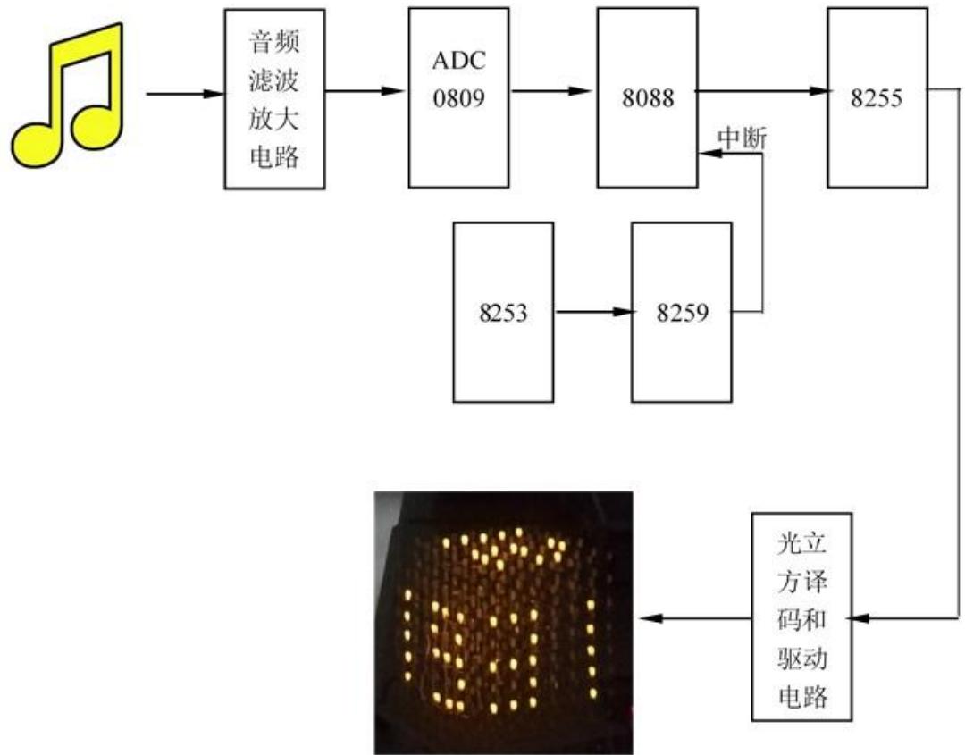 系统结构如图1所示。音乐通过麦克风经音频滤波放大电路处理后,由ADC0809实现量化采集、把模拟音频信号转换为微处理器 8088 可以直接处理的数字信号。8088 对输入音频信号进行 FFT 计算,并计算声强峰值,在中断程序中根据 FFT 计算结果和声强峰值控制 8255 各个端口的状态,8255 输出经光立方译码与驱动电路后控制 512 个 LED 点亮与熄灭状态,从而使光立方随声强和频率改变显示状态。8253产生方波信号,该信号经8259向8088定时申请中断,形成音频信号定时采集、光立方循环扫描的时间基准。