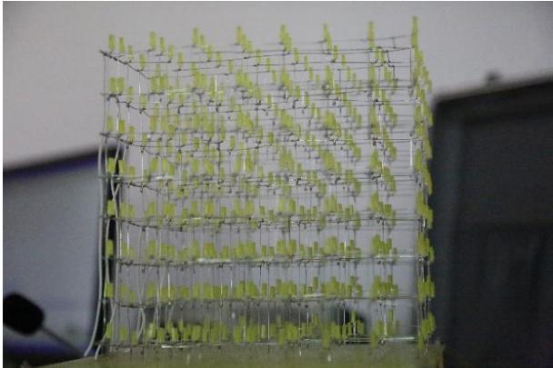 1)通过演示往届学生完成的 $4 ^ { * } 4 ^ { * } 4 { = } 6 4$ 个 LED 光立方,激发学生学习兴趣,同时指出这次实验所要完成的 $8 ^ { * } 8 ^ { * } 8 { = } 5 1 2$ 个 LED 的光立方,其工作量至少是以往的 512/64=8 倍,所以提醒学生注意 $\textcircled{1}$ 该项目需要多人组队完成,队员之间的团结协作是项目能否成功的关键因素,必须在实验前完成任务分配和进度规划,甘特图是一种行之有效的方法。 $\textcircled { 2 } 5 1 2$ 个 LED 中任何一个LED 显示不正常都会影响最终的效果,因此要在项目方案设计之初就要把可靠性、可测试性、可维修性等工程要求考虑在内。 $\textcircled{3} 6$ 个人分三批进入实验室完成相对独立的任务,每个人的工作都是后续小组完成实验的基础,在思想上强化每个学生的责任和担当,在技术上引导学生注重系统概念、工程规范、代码可重用性。