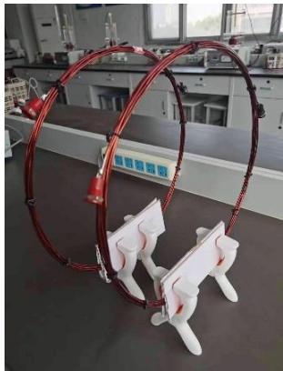 实验线圈采用线径 $1 . 8 \mathrm { m m }$ 的铜制漆包线绕制成相同尺寸大小的平面螺旋结构,半径$1 6 . 5 \mathrm { c m }$ ,匝数为 8,其电感量分别为 $L _ { 1 } { = } 6 0 . 9 \mu \mathrm { H }$ , $L _ { 2 } { = } 6 2 . 2 { \mu \mathrm { H } }$ ,高频状态下两个线圈的等效电阻分别为 0.137Ω 和 0.142Ω。