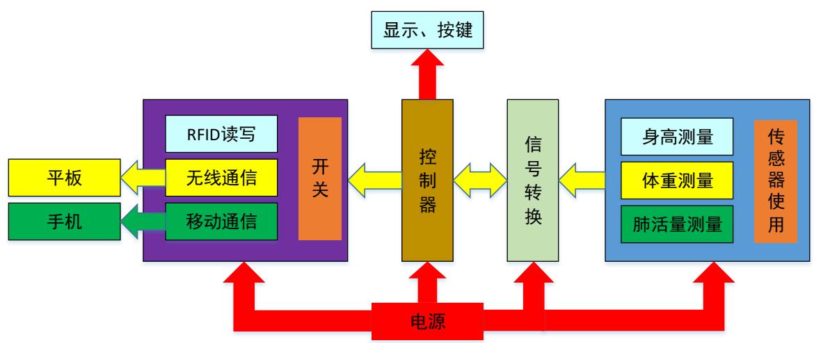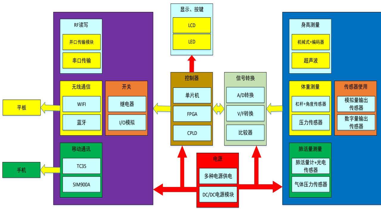 根据题设要求,该模块包含身高测量、体重测量、肺活量测量三个基本功能单元。具体实现方案选择如下: