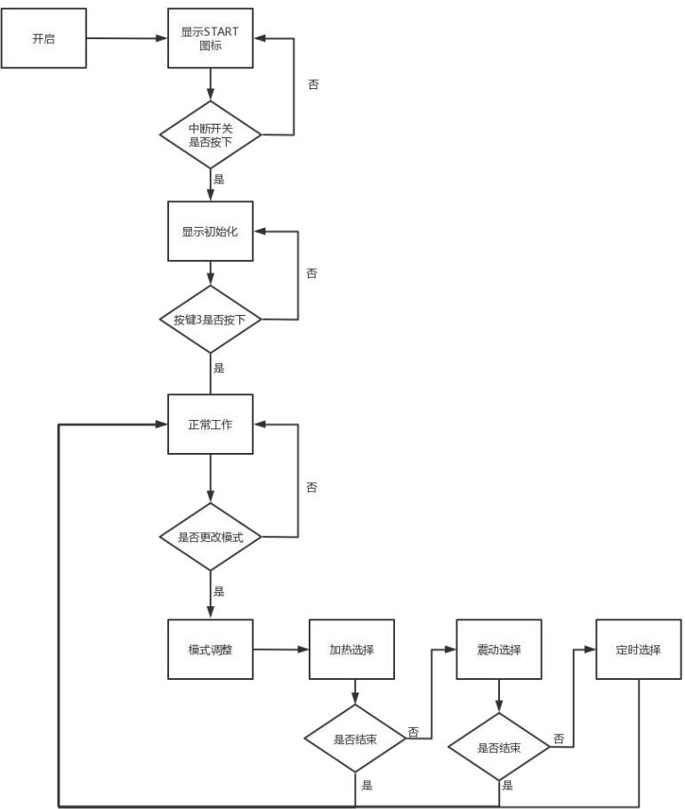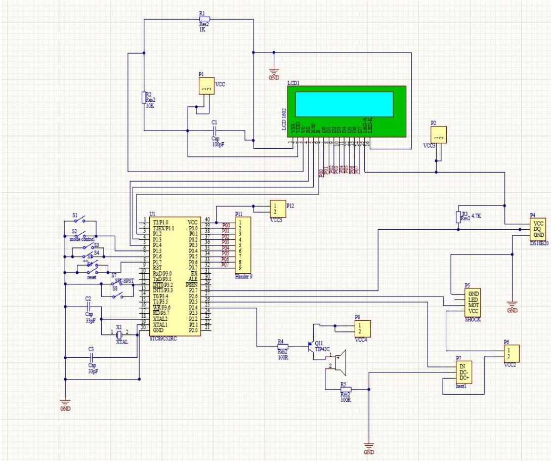 产品基于 STC89C52 芯片,利用 12MHZ 的晶振电路作为单片机的时钟,利用单片机定时器 1 控制计时,利用单片机定时器 2 控制 PWM 进而控制震动模块,利用单片机定时器2控制屏幕闪烁,设置外部中断控制整个系统。单片机P0 口与作为上拉电阻的排阻相接后连接 LCD1602 显示屏作为显示输出。单片机 P1.2-P1.4作为LCD 屏的亮度等参数控制口。单片机 P1.5-P1.7 连接开关作为控制信号,P3.2 接开关作为外部中断控制信号。单片机P2.4 口连接蜂鸣器电路,完成声音提醒功能。单片机P2.5 口连接继电的控制信号输入端,继电器的输出常开端连接PTC加热片,中间端接电源。单片机P2.6口接上拉电阻后与电机相连,完成震动功能。单片机P2.7口连接 DS18B20 温度传感器,完成温度反馈功能。XTAL1、XTAL2 接 12MHZ 晶振电路。电路 VCC 和 GND 由 AMS1117 稳压后提供。