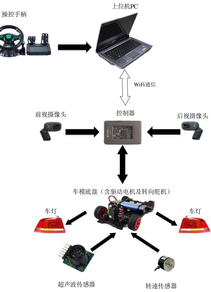 本实验所完成项目的系统组成及工作原理如图 1 所示,操控手柄与上位机 PC 相连,通过串口进行通信,上位机对操作手柄当前的方向盘旋转方向和角度、油门踏板及刹车踏板的动作及踏踩幅度等参数进行解析,并通过 WiFi无线通讯实时传送到控制器中;控制器、超声波传感器、转速传感器、前、后视摄像头安装在车模上,传感器输出的数据直接连接到控制器上的输入端口,经实时控制器采集并换算后,通过WiFi上传给上位机进行显示,并根据当前上位机命令对车模的运动状态进行控制;USB 摄像头通过 USB 端口与控制器直接连接,控制器将两个摄像头采集的前、后视图像通过WiFi上传给上位机进行显示,供用户观察;控制器接收到上位机发送的操纵手柄当前的状态参数,利用其 PWM 通道控制车模驱动电机和转向电机的转向、转速与手柄状态一致。其中,上位机及控制器内程序的开发基于 NI LabVIEW 软件平台,主要的硬件产品如下:控制器采用 NI myRIO 实现,汽车底盘选用飞思卡尔智能车模型(含驱动电机及转向舵机),摄像头选用高清 USB 接口产品。