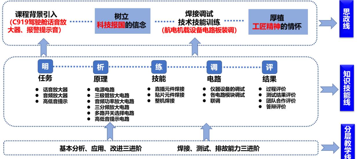 “思政线”:从 C919 大飞机驾驶舱话音放大、报警提示音的项目背景引入,进一步拓展到高铁或地铁中语音提示及播报系统,让学生了解中国高铁、地铁、大飞机的高速发展,从而树立学生科技报国的信念,通过对电路板焊接调试等技术技能的训练,厚植工匠精神的情怀。