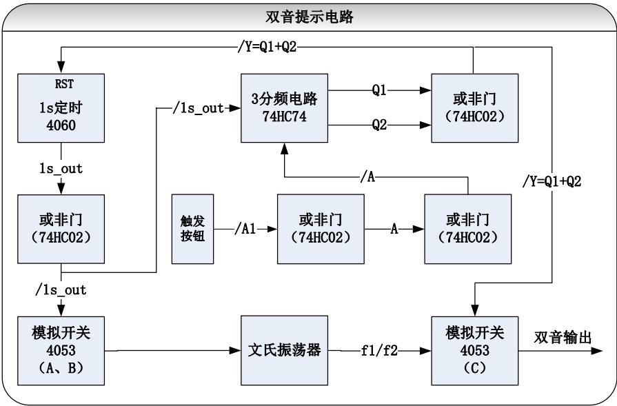 给出双音提示电路框图,电路中采用了哪两类IC?