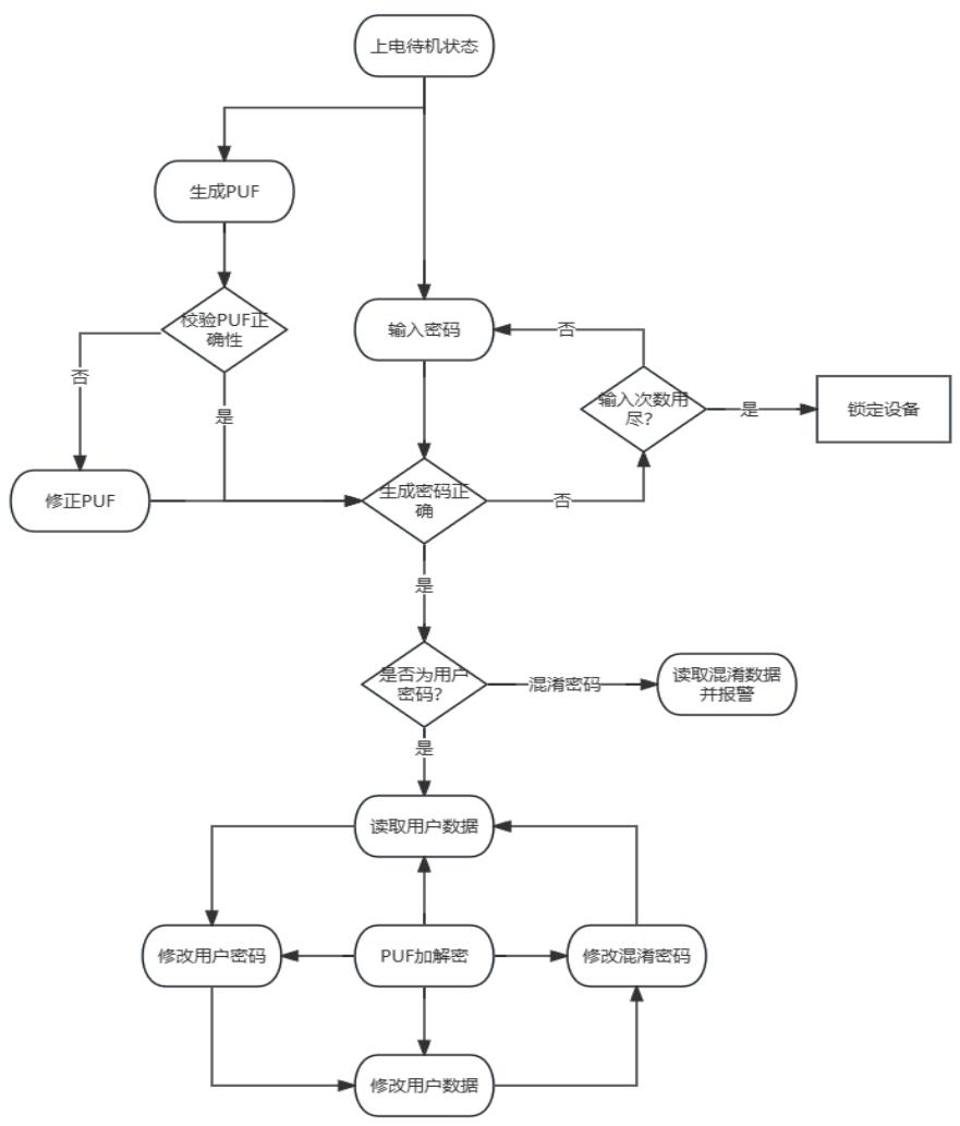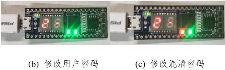 (4) 用户在正确解锁后,使用功能键实现修改用户密码、修改数据、修改混淆数据功能切换。为保证混淆密码和用户密码的非重复性,当其中一个密码被用户修改为另一个密码时,系统会拒绝执行此操作并亮起密码警示灯,要求重新修改密码。