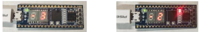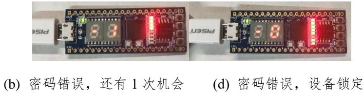 (a) 设备待机状态 (b) 密码错误,还有 2 次机会(2) 用户使用数据输入薄码开关和确认键输入密码后,随密码输入失败次数的增加,密码警报灯会增加亮起数量,失败次数达三次后,锁定设备无法解锁,如图 8-7所示。
