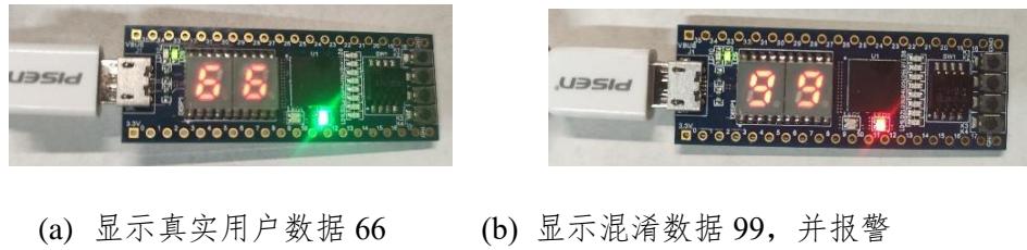 (3) 用户利用删除键修改输入内容,输入用户密码后,设备解锁(状态指示灯为绿色),屏幕显示真实的用户数据,如图8-8(a)所示;若用户输入混淆密码,则设备报警(状态指示灯为红色),同时显示混淆数据以迷惑“小偷”,确保用户真实数据资产的安全性,如图 8-8(b)所示。