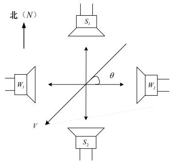 基于相对时差法的对射式风速风向测量系统结构如图 4 所示,其中四个传感器均为收发一体式超声波探头,按照如图所示正交结构布置,水平或垂直探头之间距离均为 $L$ 。假设与其处于同一平面上的风速大小为 $V$ ,与 $S _ { 1 } S _ { 2 }$ 探头来风方向的夹角 $\theta$ 表示风向角, $V _ { s }$ 和 $V _ { \scriptscriptstyle { W } }$ 分别表示 $S _ { 1 } S _ { 2 }$ 和 $W _ { 1 } W _ { 2 }$ 方向上的风速分量。根据图 4 对射式测风系统结构可知,当有风时,实际的超声波传播速率会受到风速分量的影响,通过测量实际的超声波传播时间即可计算得到风速分量,进而获得实际的风速风向值。