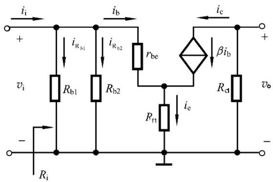 $$ v _ { i } = i _ { b } r _ { b e } + i _ { b } ( 1 + \beta ) R _ { f 1 } $$