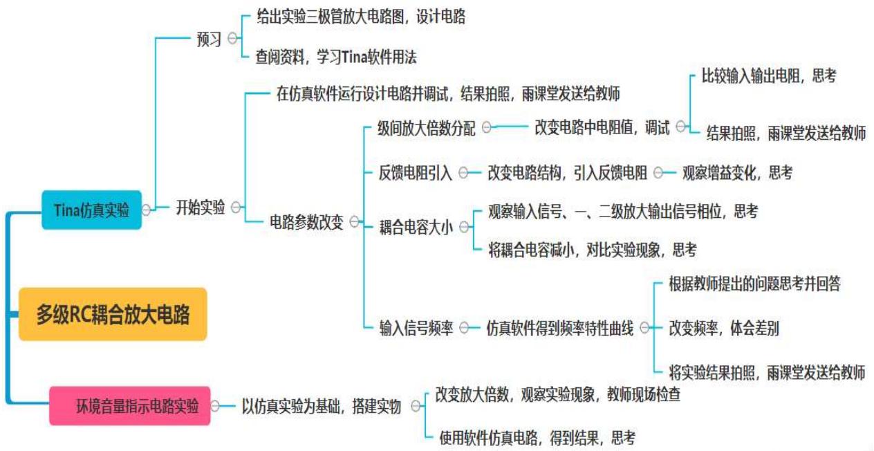 本实验是一个比较完整的工程应用类实验,实验以“声音线索”为暗线,将影响多级放大电路工作特性的诸多影响因素巧妙地穿插起来,实验设计生动有趣,激发学生学习热情,引导学生深入思考。实验设计与实施进程如图 1 所示,可分为 Tina 仿真实验和环境音量指示电路实验,4 学时内完成。