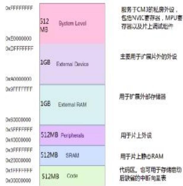 $\gtrdot$ 逻辑左移(LSL)、逻辑右移(LSR)、算术右移(ASR)、循环右移(ROR)本实验箱所采用STM32处理器芯片的存储器地址映射如下: