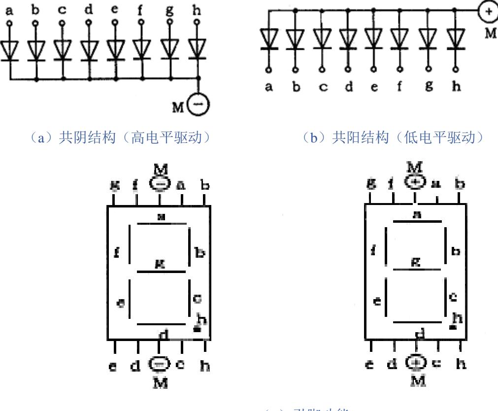 七段显示器又称 LED 数码管,一个 LED 数码管可用来显示一位 $0 { \sim } 9$ 十进制数和一个小数点。下图 7 为共阴管和共阳管的电路和两种不同出线形式的引出脚功能图。