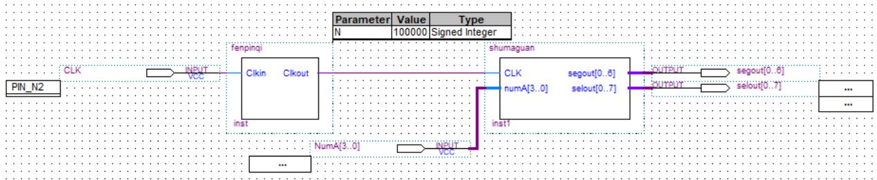 本实验采用的含计数、译码、显示三个模块的学号显示电路原路如下: