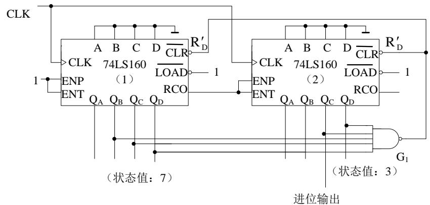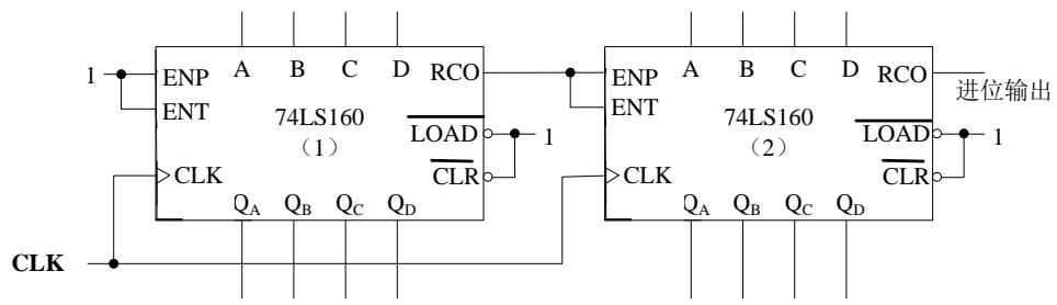 (3)两片74LS160 扩展实现模制大于十进制的计数器
