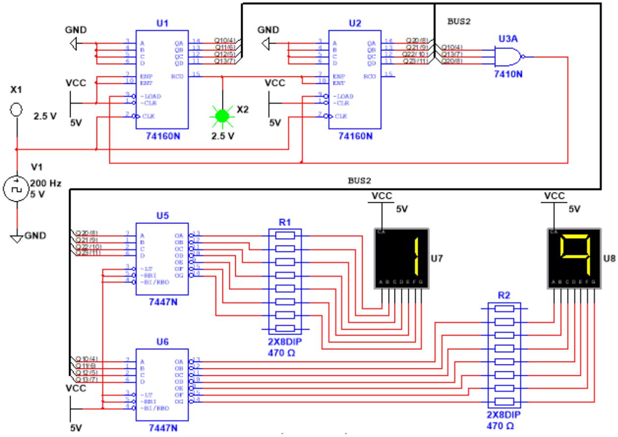 4)组合计数、译码、显示电路,并基于 Multisim 仿真实现两位学号的显示;