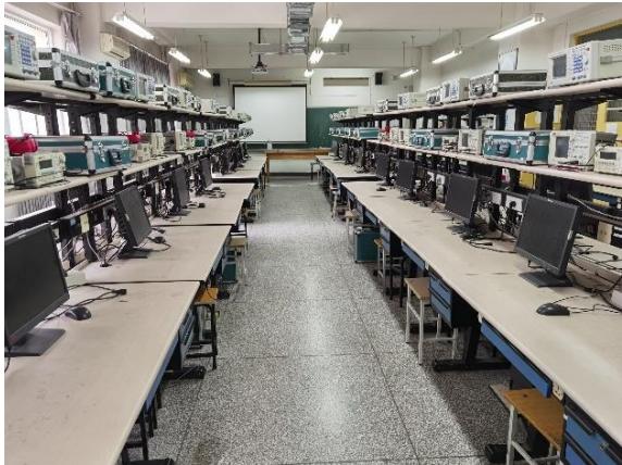 数电实验室见下图 2,每个实验室平均使用面积约 120 平方米,共有 35 个实验台。每个实验台上都配有稳压电源、信号发生器、数字示波器和万用表等仪器设备,也配备了数电实验箱;同时实验室也具备搭建电路、焊接等操作的条件;每个实验台也都配备了一台电脑,供学生进行仿真和编程等操作。